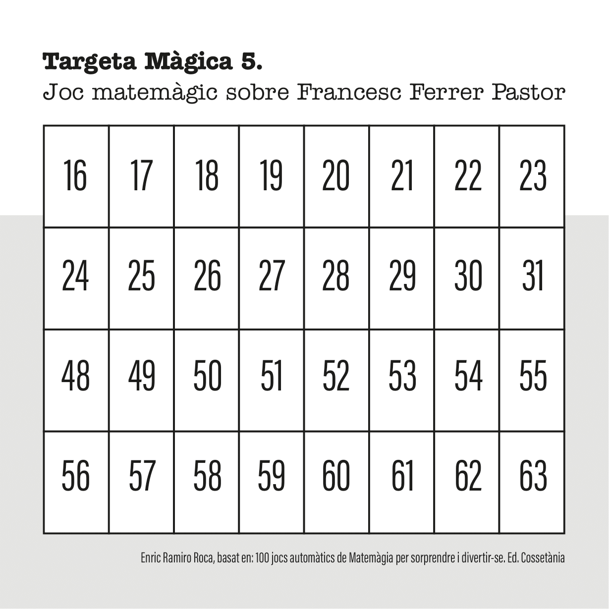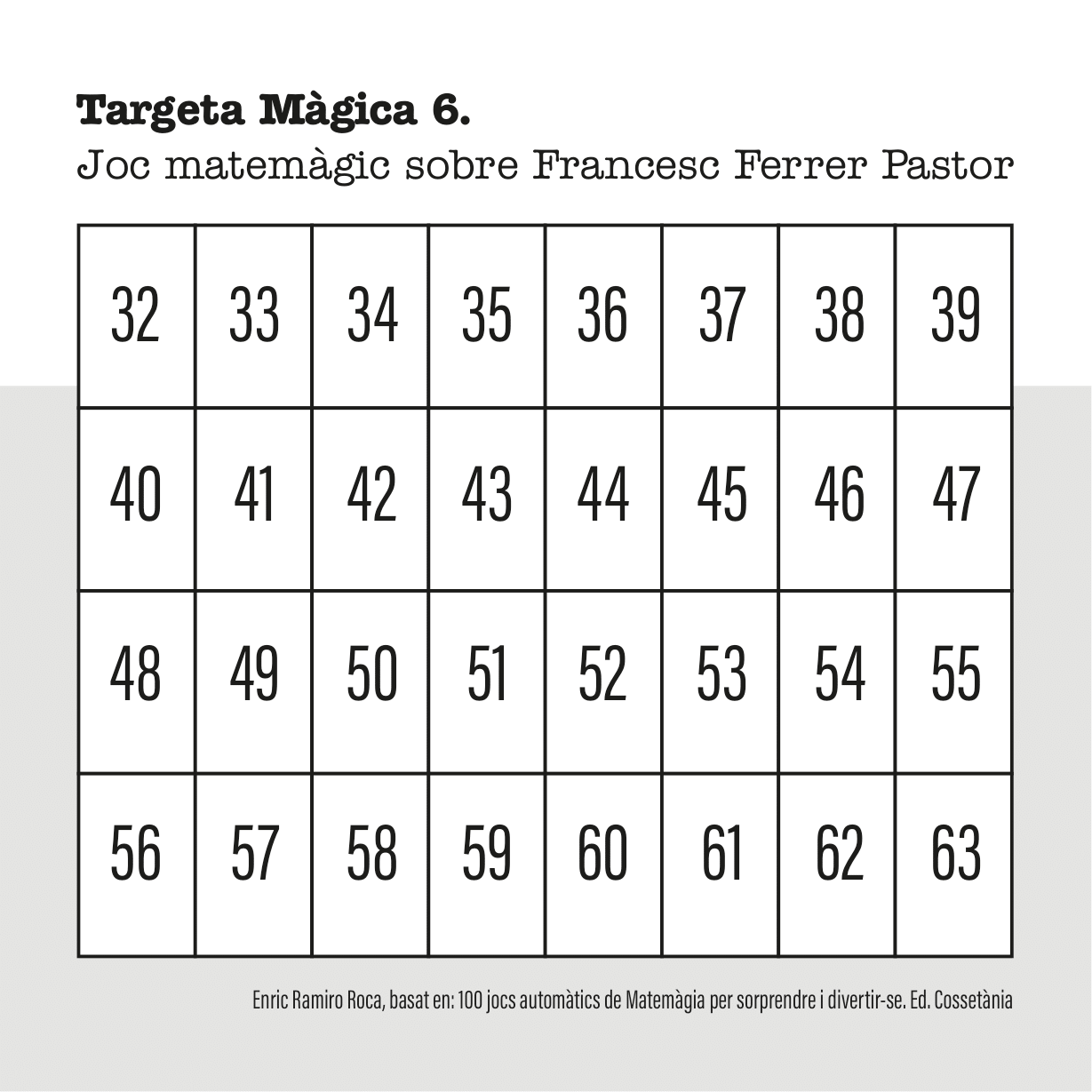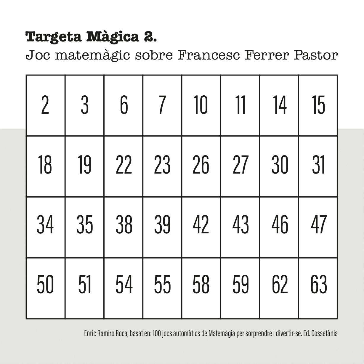 A continuació vos expliquem com utilitzar les fitxes per a endevinar el dia de naixement i el mes. Tens sis targetes màgiques que comencen pels nombres 1, 2, 4, 8, 16, 32 (la suma total són 63).