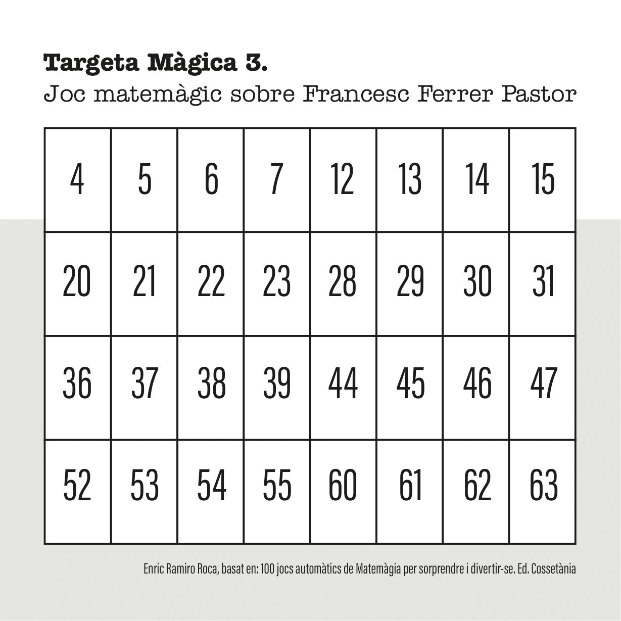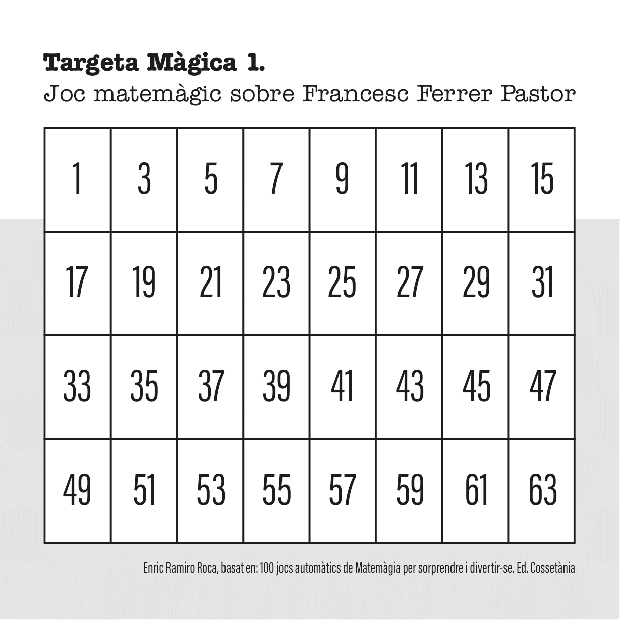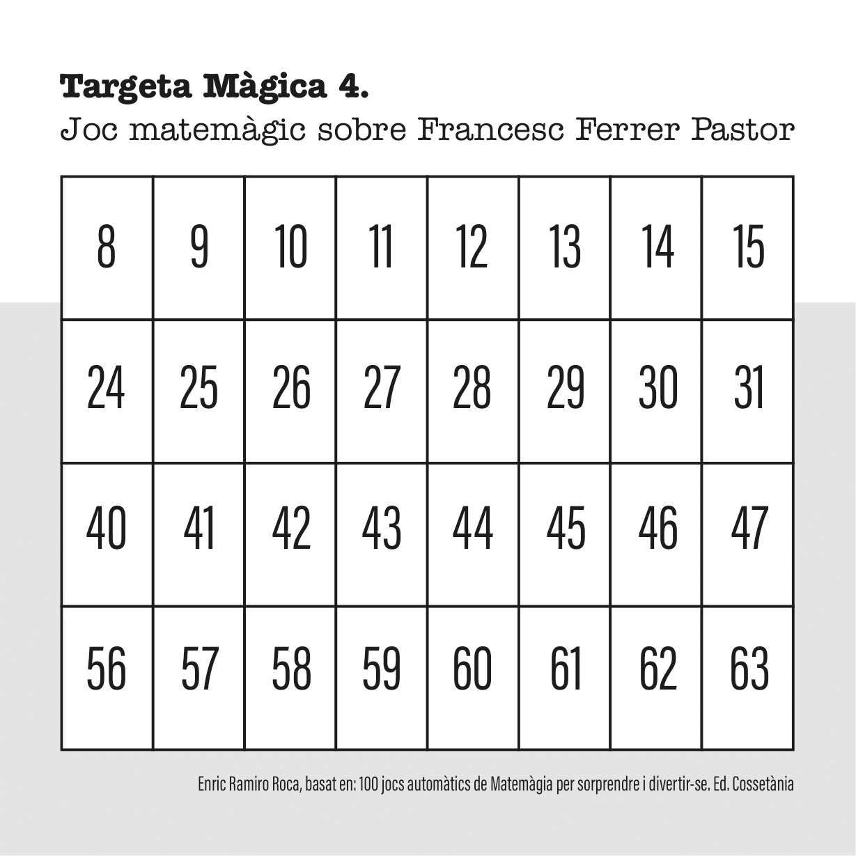 A continuació vos expliquem com utilitzar les fitxes per a endevinar el dia de naixement i el mes. Tens sis targetes màgiques que comencen pels nombres 1, 2, 4, 8, 16, 32 (la suma total són 63).